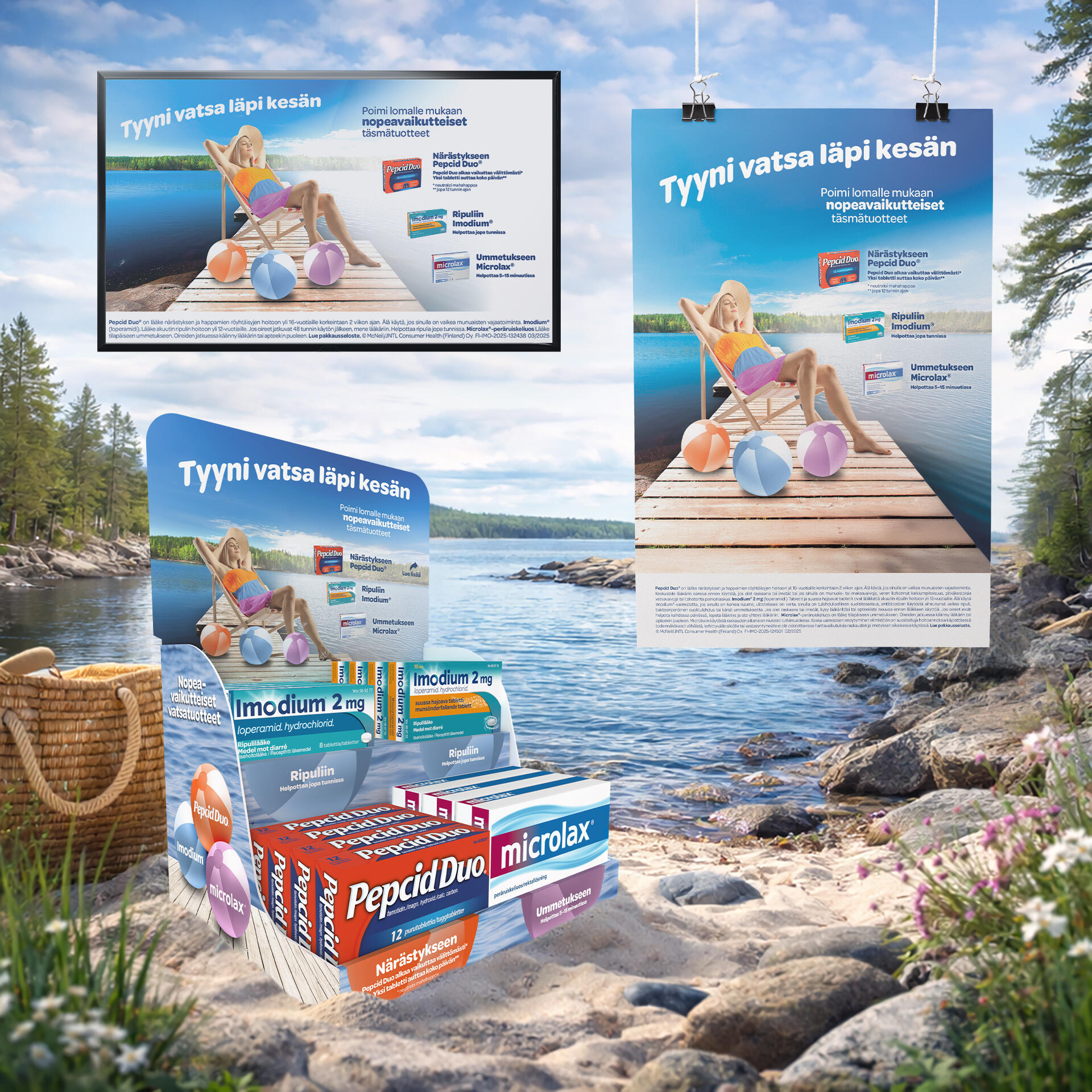 Kesäkampanja apteekkeihin Imodium-, Pepcid Duo- ja Microlax-tuotteille, jossa keskiössä oli yksi selkeä tavoite: tehdä herkästä ja usein vältellystä aiheesta helposti lähestyttävä – ja samalla ohjata ostopäätöstä tehokkaasti.Rakensin kampanjan visuaalisen ilmeen ja viestinnän niin, että se puhuttelee nopeasti apteekkiympäristössä: kirkas kesäteema, helposti tunnistettava tilanne ja selkeä hyöty asiakkaalle. Lopputulos madalsi kynnystä tarttua tuotteisiin ja auttoi asiakasta löytämään oikean ratkaisun vaivaan.Kokonaisuus toteutettiin laajasti eri formaateissa – julisteista pöytätelineisiin ja diginäyttöihin – varmistaen, että viesti toistuu johdonmukaisesti ja erottuu ympäristöstään.