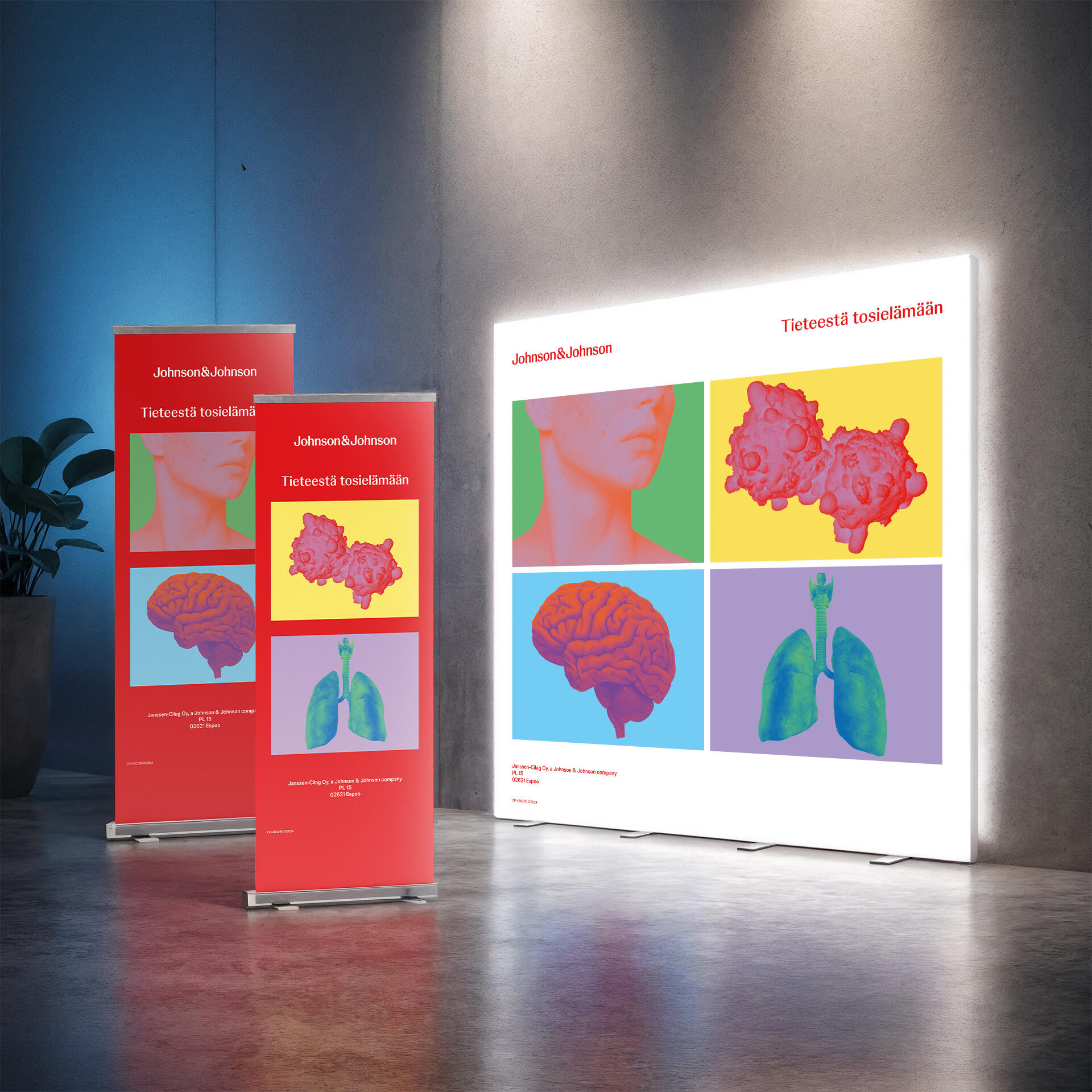 Johnson & Johnson messumateriaalikokonaisuus, joka auttoi osastoa erottumaan tapahtumaympäristössä ja ohjaamaan kävijöiden huomion olennaiseen.Kokonaisuus sisälsi valaistun messuseinän sekä roll upeja, jotka yhdessä loivat selkeän ja yhtenäisen visuaalisen ilmeen.Lopputulos tuki kohtaamisten syntymistä ja vahvisti brändin läsnäoloa tapahtumassa johdonmukaisella ja huomiota herättävällä tavalla.