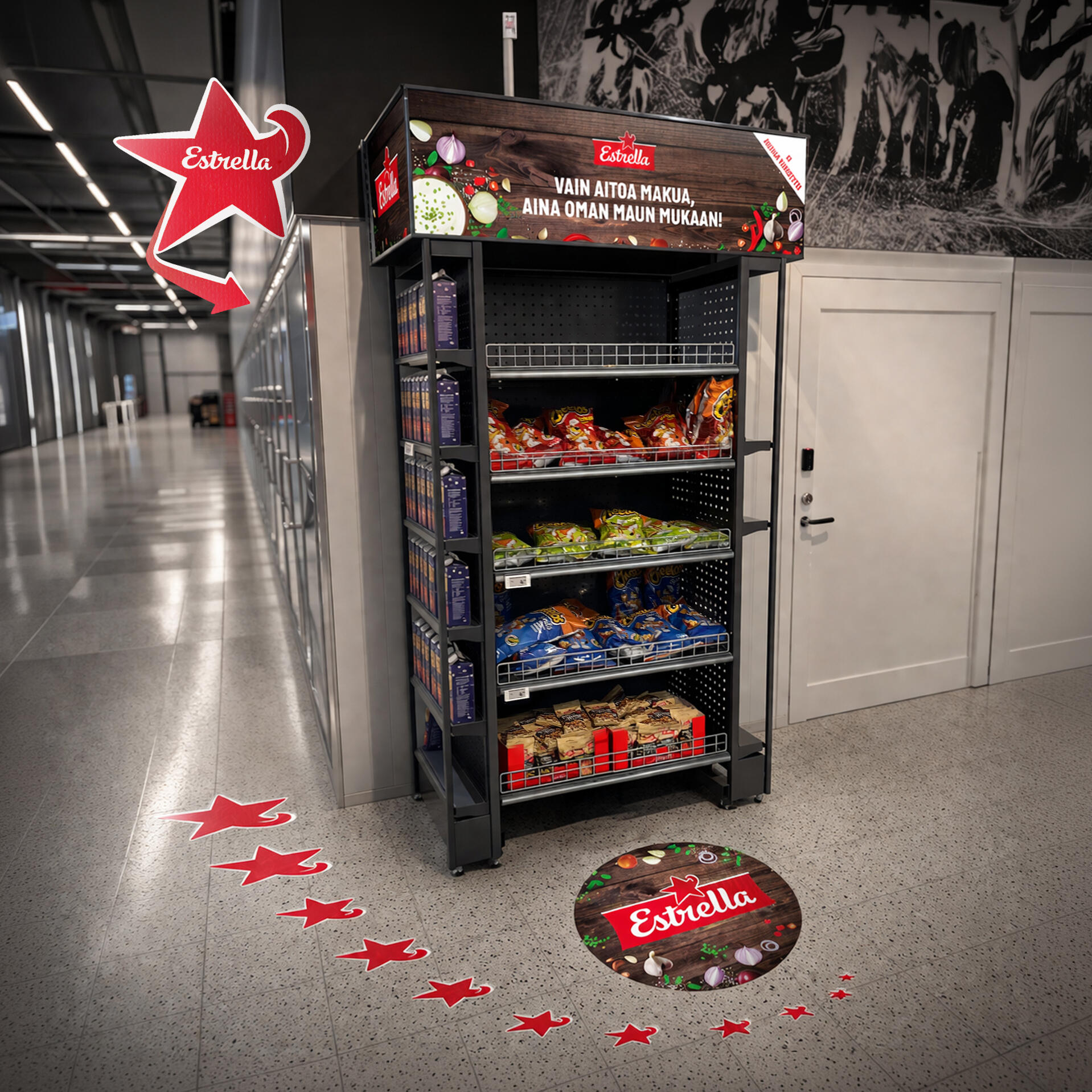 Toteutin Estrella -hyllykokonaisuuden K-Citymarket Ideaparkiin, jossa tavoitteena oli tehdä isosta kokonaisuudesta houkutteleva joka tukee ostotilannetta suuressa kauppaympäristössä.Valmistin kokonaisuuden niin, että se ohjaa huomion hyllyyn ja tekee valikoimasta selkeästi löydettävän myös kiireisessä ympäristössä. Suuren hyllyn visuaalit, lattiatarrojen sekä seinäkyltin ohjaavuus toimivat yhdessä yhtenäisenä ratkaisuna, joka vahvistaa brändin näkyvyyttä ja asiakkaan ostohalua.Lopputulos ei jää pelkäksi tuotehyllyksi muiden joukossa, vaan tekee tuotteista helpommin löydettäviä ja tukee ostopäätöstä suoraan myymälätilassa.